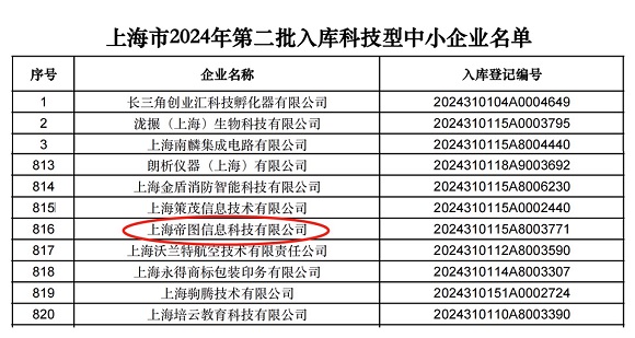 9月5日,上海科學技術委員會發布的《上海市2024年第二批入庫科技型中小企業名單》,上海帝圖信息科技有限公司再次上榜!